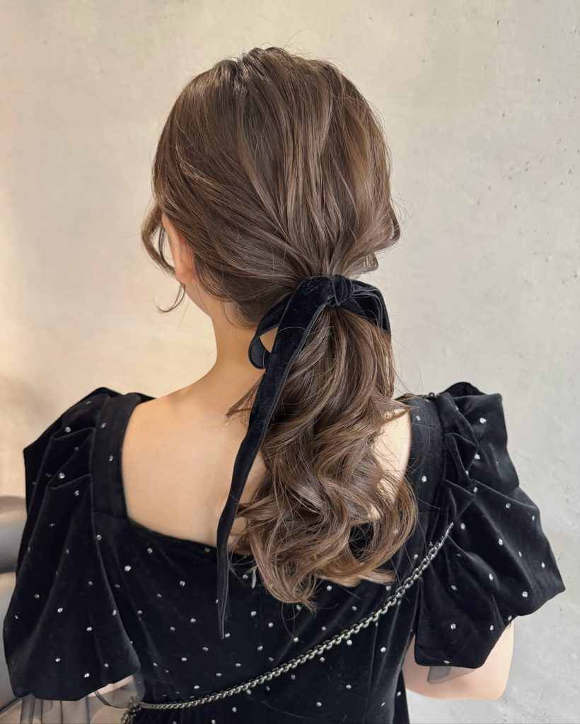 Alternatif lainnya adalah low ponytail yang dipadukan dengan hair band atau pita, sehingga detail rambut terlihat lebih menonjol dan mencerminkan gaya personal yang unik.