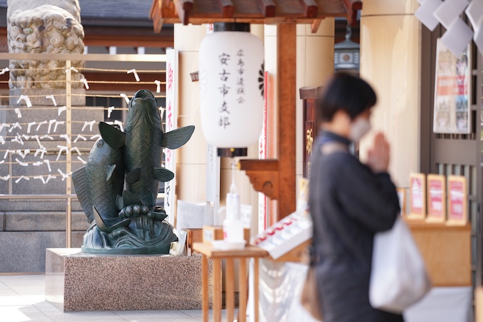 Terletak di dalam area bekas Kastil Hiroshima yang juga dikenal sebagai “Carp Castle”, di sisi kiri dan kanan aula doa terdapat patung ikan koi.