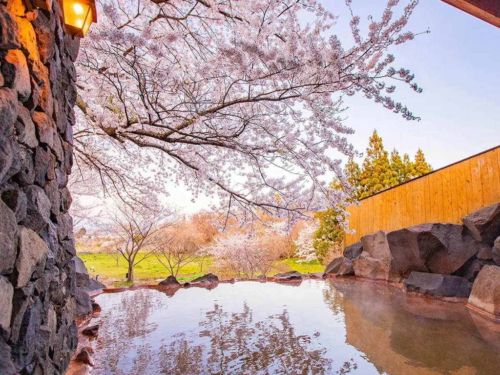 Duduk santai di pemandian air panas terbuka, kamu bisa melihat sakura bermekaran di taman tengah. Pohon Somei Yoshino berusia sekitar 50 tahun menghadirkan nuansa musim semi yang memikat.