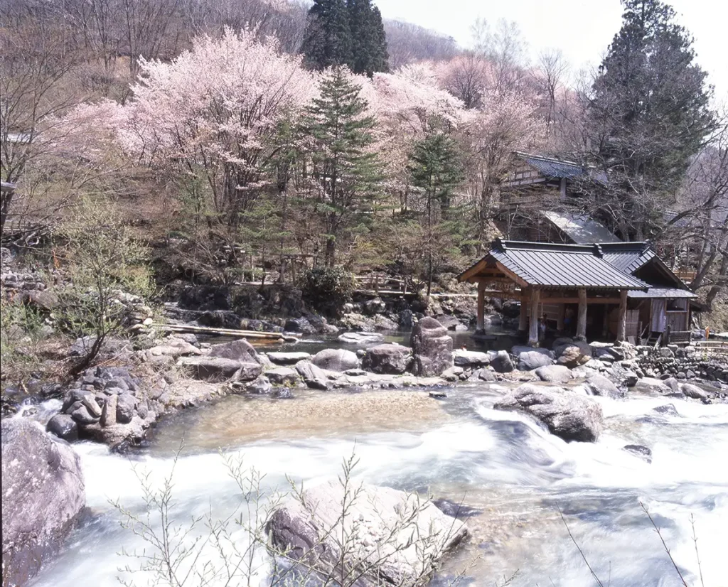 Berendam di sini, kamu bisa menikmati sakura liar yang tumbuh alami di sepanjang Sungai Takaragawa, menyatu harmonis dengan alam.