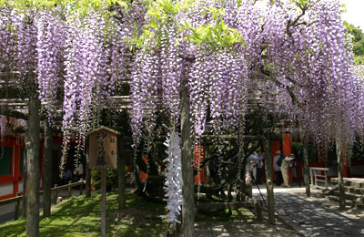 Salah satu momen paling indah di Kasuga Taisha adalah saat bunga wisteria berusia lebih dari 700 tahun mekar pada awal Mei.