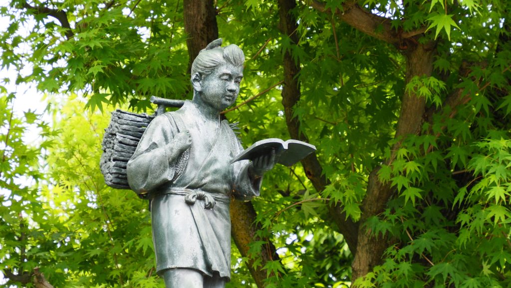 Di sekolah Jepang sering ada patung Ninomiya Kinjiro yang membawa kayu bakar sambil membaca buku.