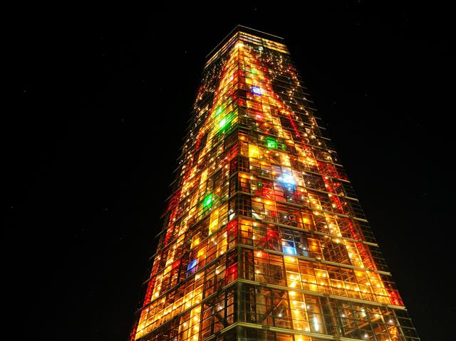 Tampilan pohon Natal ini dibuat dari 3.500 lampu bohlam dan lampu neon, yang berkilauan setiap hari mulai pukul 17.00.