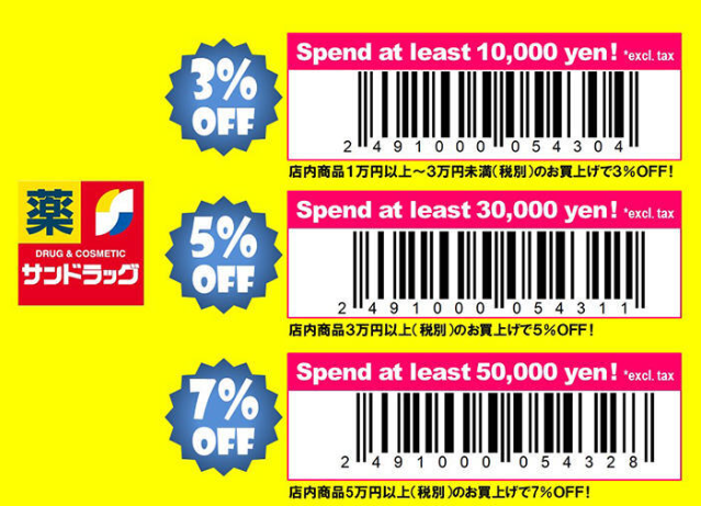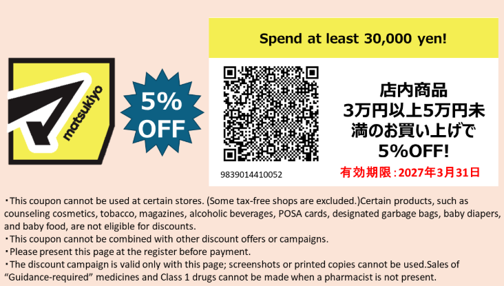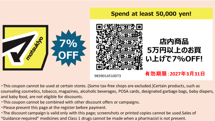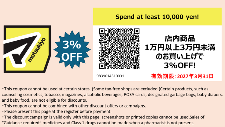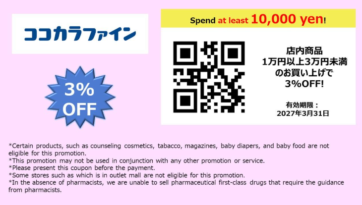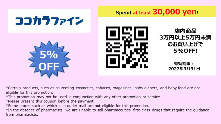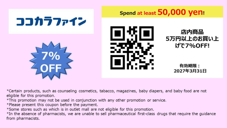 Nikmati diskon hingga 7% di apotek besar di Jepang. Silakan periksa daftar toko dan detail lainnya di bawah.