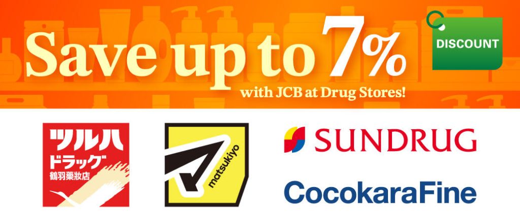 Anda dapat menikmati diskon hingga 7% di toko obat (drug store) Jepang populer di bawah. Tingkat diskon berbeda tergantung toko obat. Anda harus menunjukkan kupon di kasir sebelum membayar dengan kartu JCB Anda. Silakan lihat di bawah untuk detail lebih lanjut.