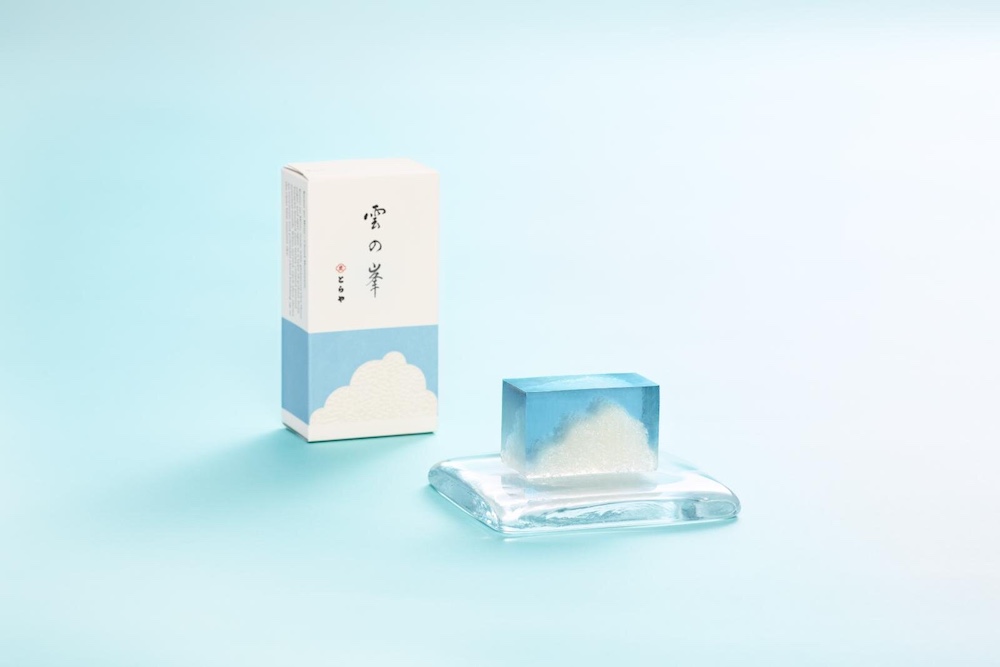 Menggunakan “kohaku yokan” transparan seperti langit biru, dipadukan dengan “Domyoji yokan (berisi butiran beras ketan)” yang menyerupai gumpalan awan putih, menciptakan tampilan musim panas yang segar.
