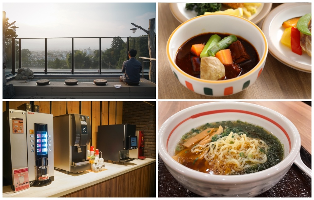 Tersedia juga minuman gratis sepuasnya di bar minuman restoran lantai 1 (15.00 – 23.00), serta “Yonaki Soba”, ramen malam gratis yang disajikan setiap malam (21.30 – 23.00).