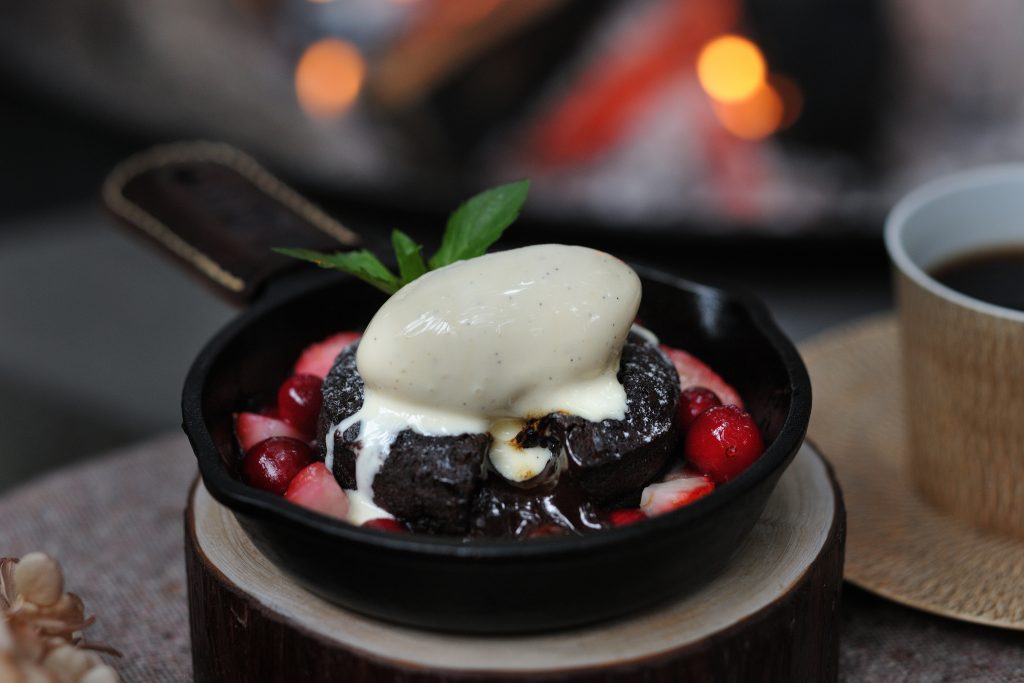 Disajikan bersama es krim vanila dan saus beri, hidangan ini dinikmati dalam keheningan hutan musim dingin. Tentunya, ini menghadirkan pengalaman dessert yang mewah sekaligus menenangkan.