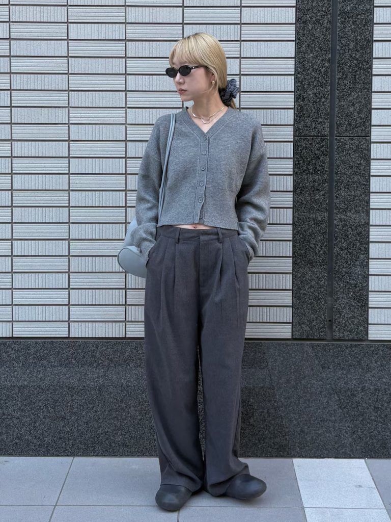 Padukan grey cardigan dengan grey casual suit pants untuk tampilan simpel namun tetap menarik. Jika ingin terlihat lebih layered, gunakan teknik layering dengan shirt + shirt, sehingga detail outfit tampak lebih fashionable dan eye-catching.