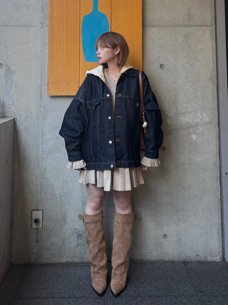 3. Denim Jacket + Pleated Skirt