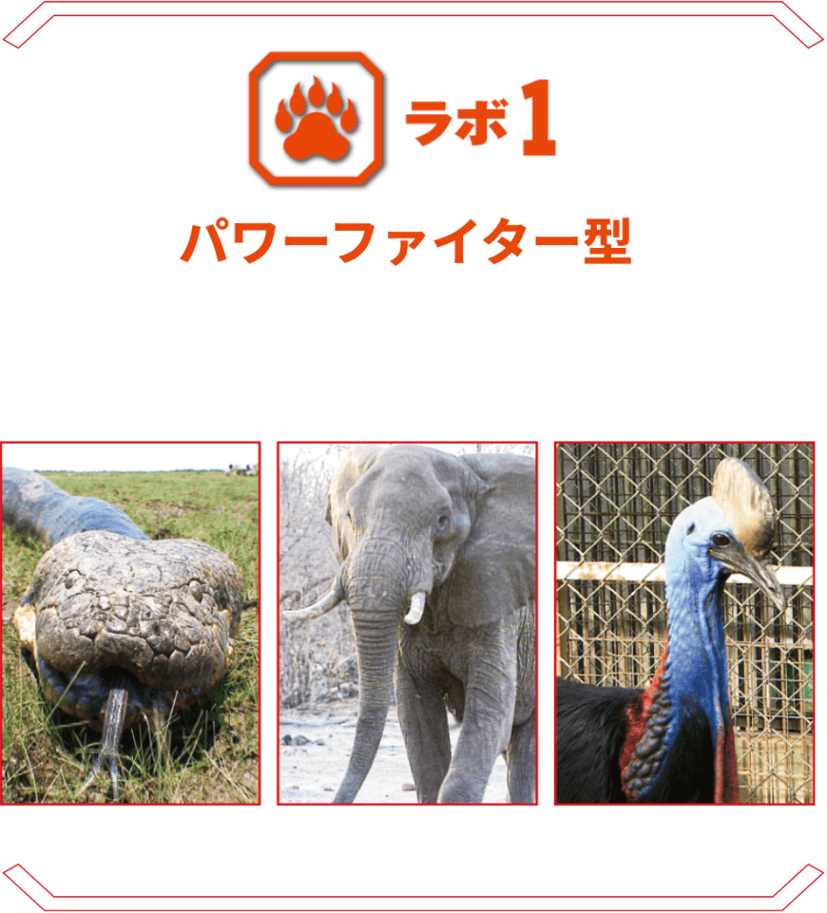Sebagai contoh, gajah Afrika yang dikategorikan sebagai “petarung tipe kekuatan” ditampilkan secara tiga dimensi melalui teknologi hologram terbaru untuk memperlihatkan struktur belalainya, serta menghadirkan ulang kekuatan luar biasa yang dapat dihasilkannya dengan sensasi yang begitu nyata.