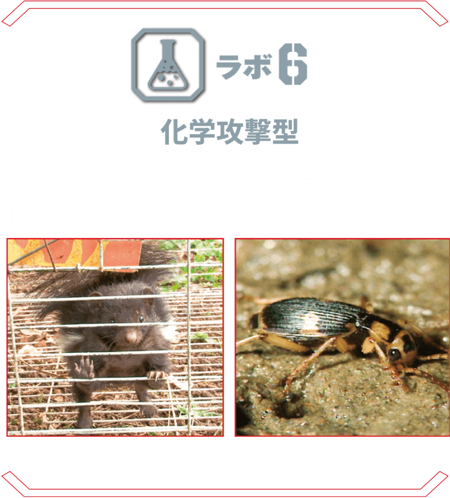 Makhluk dengan “jurus mematikan” layaknya eksperimen kimia. Termasuk sigung yang dapat mengeluarkan bau menyengat serta menyemprotkan gas bersuhu tinggi hingga sekitar 100°C, dan makhluk dengan cairan lambung yang sangat korosif. Kemampuan serangan kimia mereka yang luar biasa akan diungkap satu per satu.