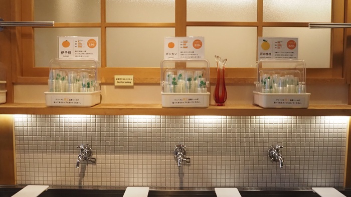 Di kawasan pertokoan Dogo Onsen, “Ehime no Shokutaku 1970” adalah toko “keran jus jeruk” yang paling direkomendasikan oleh penulis karena pilihan jenisnya sangat beragam.