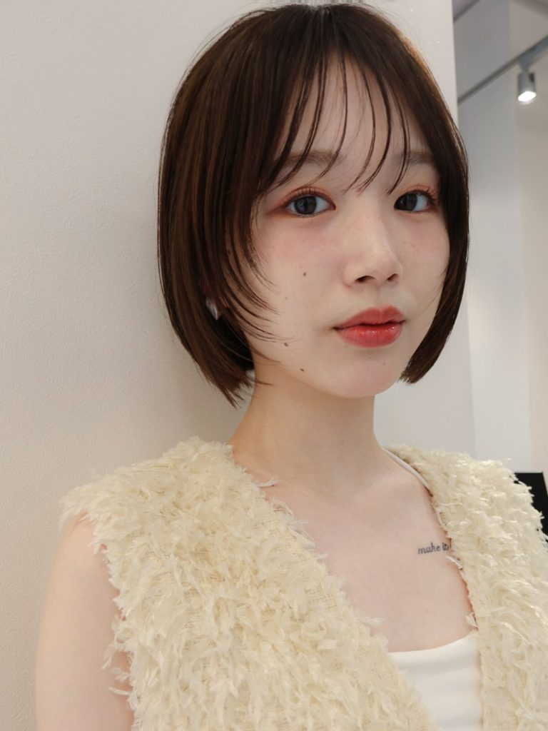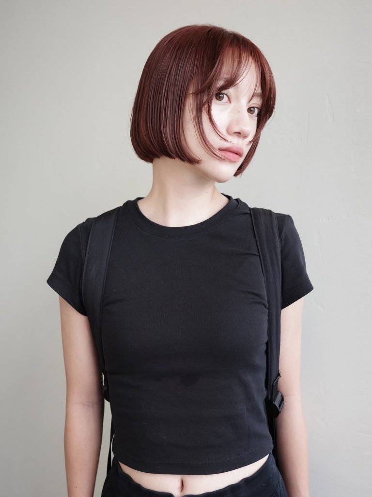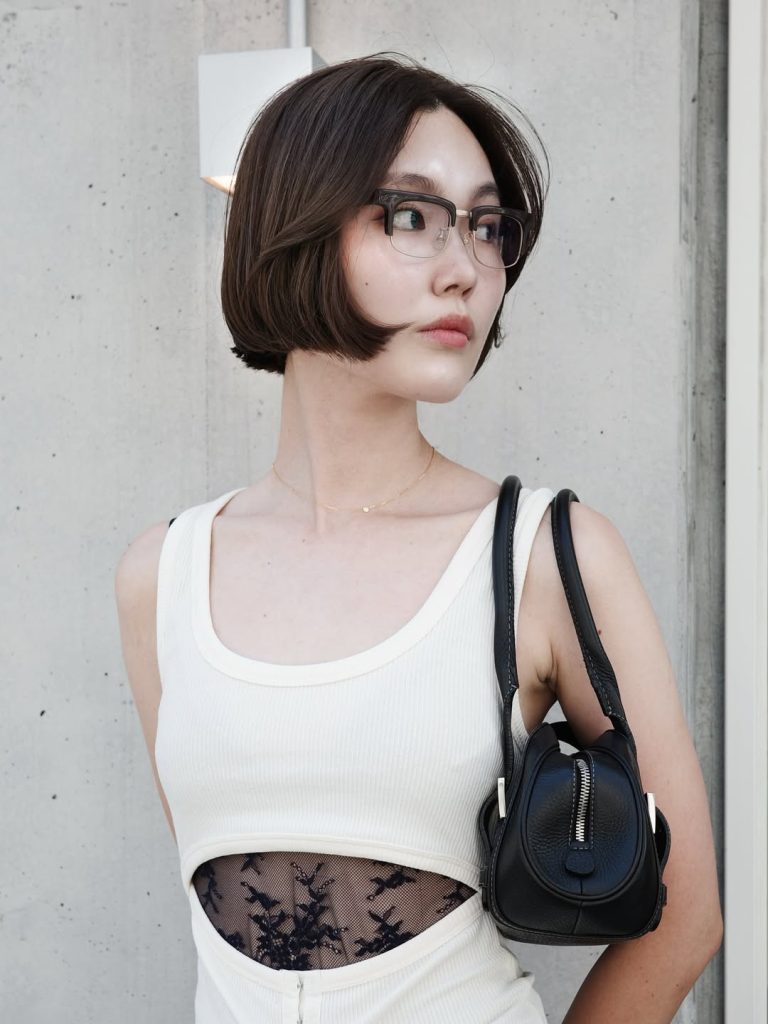Bob dengan ujung rambut sedikit tebal memang selalu jadi favorit para pecinta gaya minimalis. Jika ingin tampil lebih elegan dan dewasa, kamu bisa menambahkan poni belah tengah.