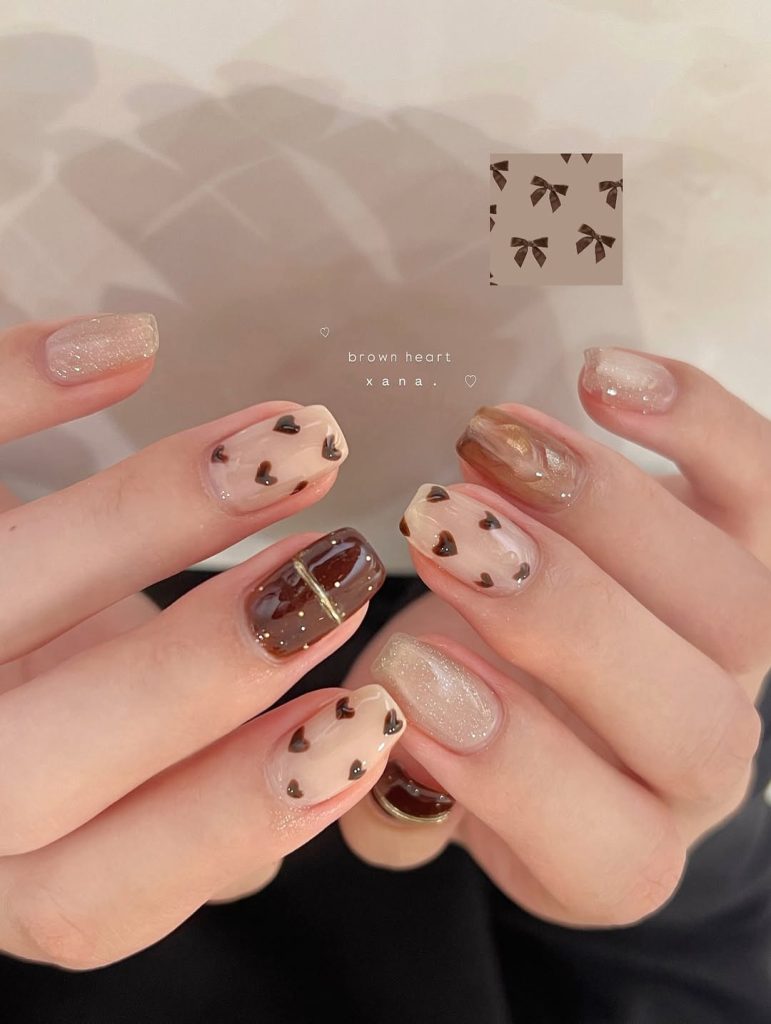 Terinspirasi dari kue dan permen, desain ini menggunakan hiasan glitter, motif hati, dan warna nude untuk menampilkan nuansa imut serta kebahagiaan yang manis.