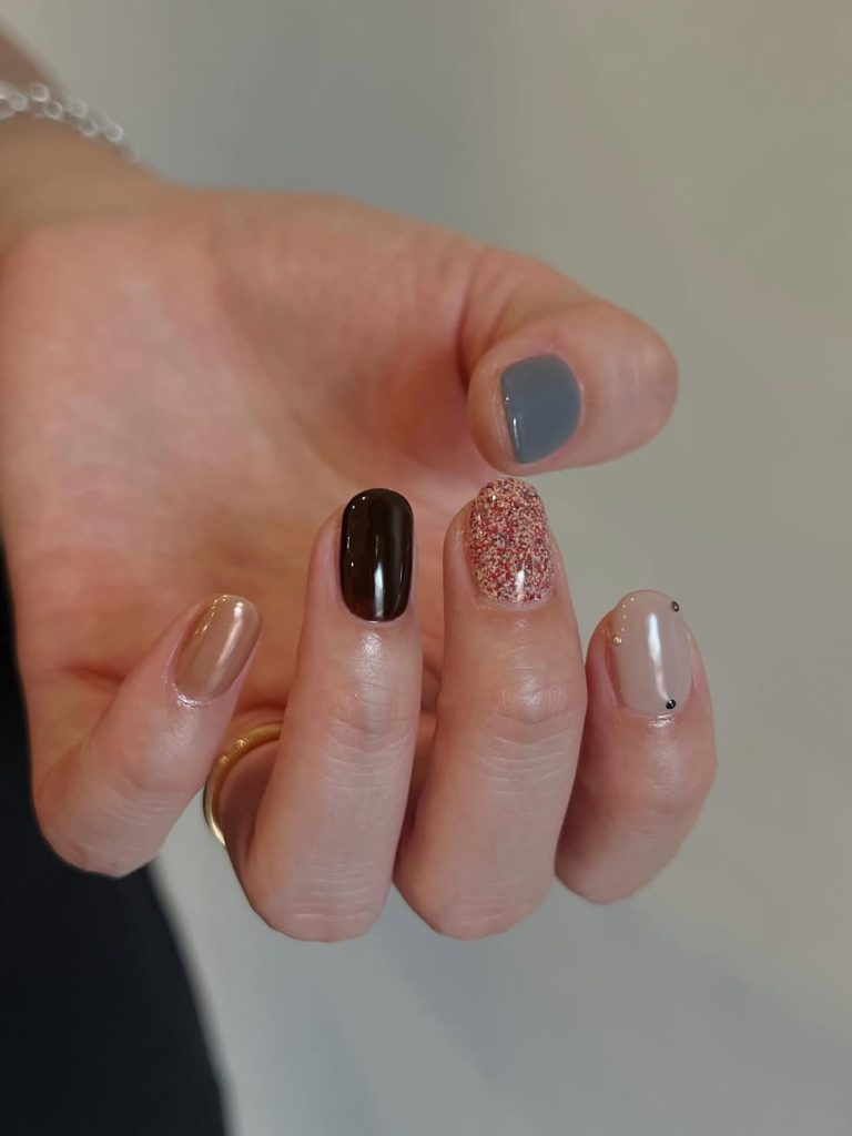 Bagi kamu yang menyukai gaya nail art sederhana dan rapi, di musim gugur ini kamu bisa mencoba kombinasi warna solid seperti perpaduan glossy + French tip atau beberapa warna kuku dalam satu tampilan.