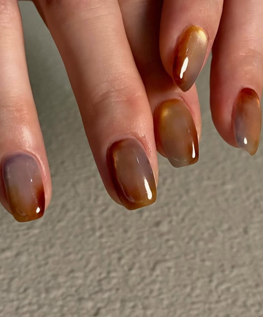 Warna kuku bergaya gradasi atau ombre yang memadukan nuansa kopi, kuning tanah, dan khaki ini seolah menggambarkan perpaduan pemandangan daun ginkgo dan maple di musim gugur.
