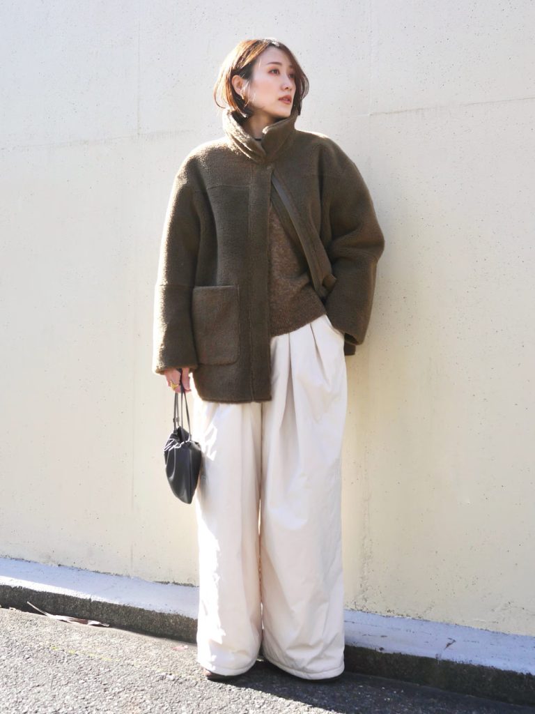 Kombinasikan furry jacket dengan pleated pants untuk tampilan travel look yang nyaman namun tetap fashionable. Di bagian dalam, kamu bisa mengenakan knit top atau basic inner top sebagai pilihan layering yang fleksibel.