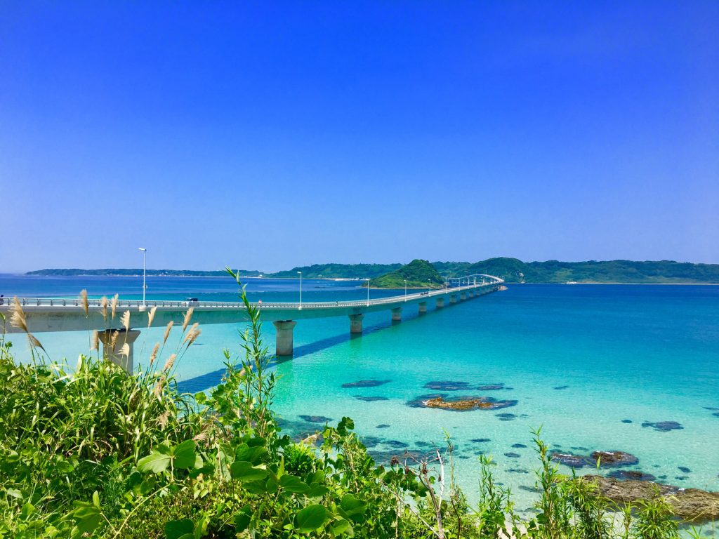 Pulau Tsunoshima yang tampak “mengapung” di laut biru jernih, serta jembatan panjang yang menghubungkannya dengan Honshu, menciptakan pemandangan layaknya resor tropis.