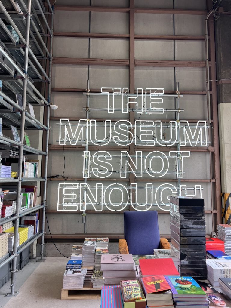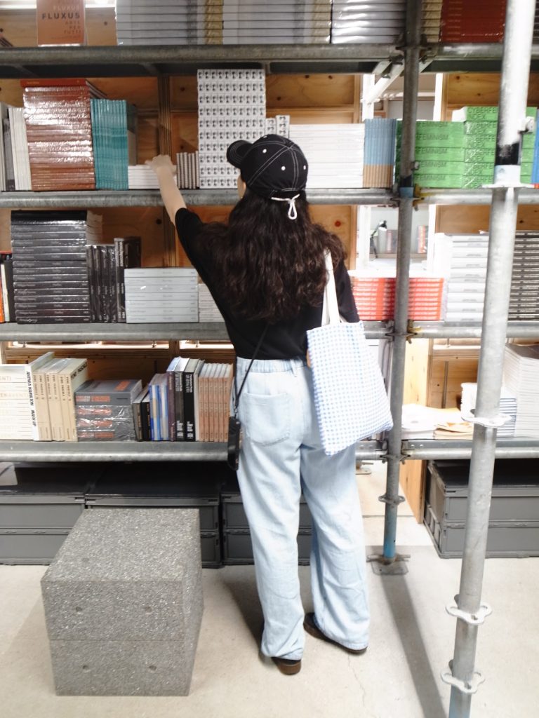 Rak buku di sini dibangun menggunakan rangka pipa layaknya perancah bangunan, menampung berbagai buku bertema seni.