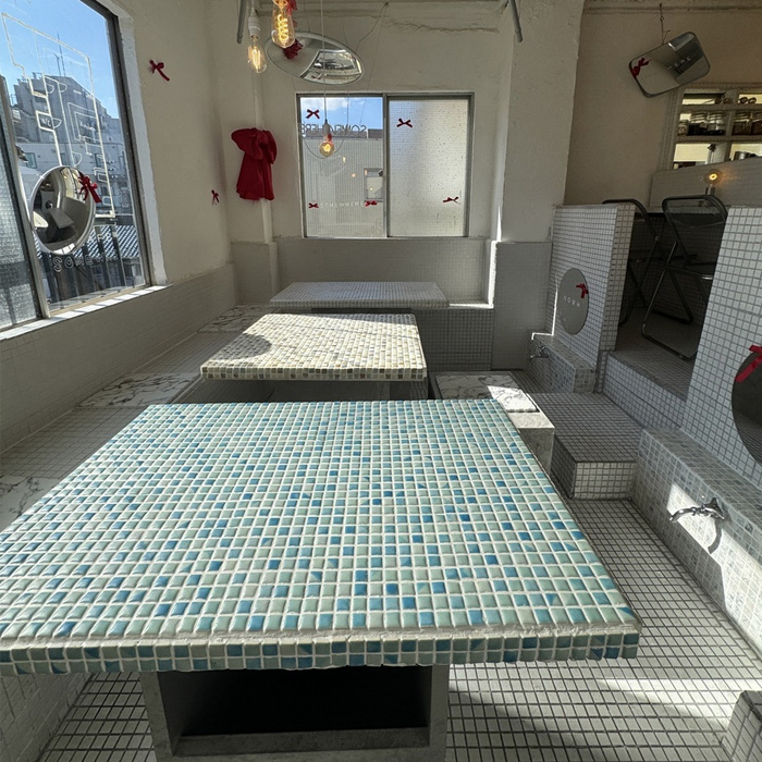 Namun tanpa disadari, karena merasa prosesnya menyenangkan, ia terus menambah pemasangan hingga akhirnya meja bar, meja makan, dan berbagai sudut lainnya juga dipenuhi ubin. Ini menciptakan konsep kafe dengan nuansa sento di seluruh ruangan.