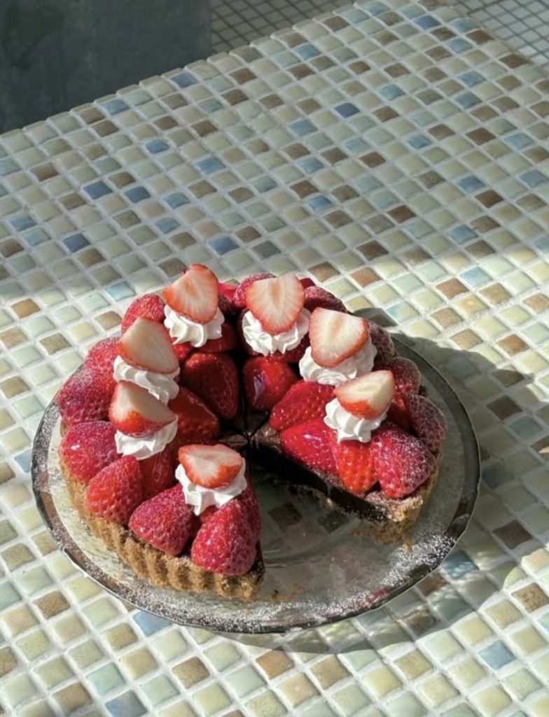 Seperti strawberry tart yang bagian atasnya dipenuhi dengan stroberi segar musiman. Kemudian dipadukan dengan isian cokelat yang kaya serta crust tart di bagian bawah.