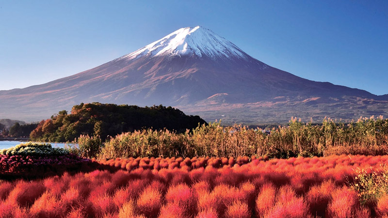 Setiap musim gugur, tanaman kochia di taman ini berubah menjadi warna merah. Bentuknya yang bulat-bulat berpadu dengan latar Gunung Fuji menciptakan kesan seperti lukisan yang penuh imajinasi.